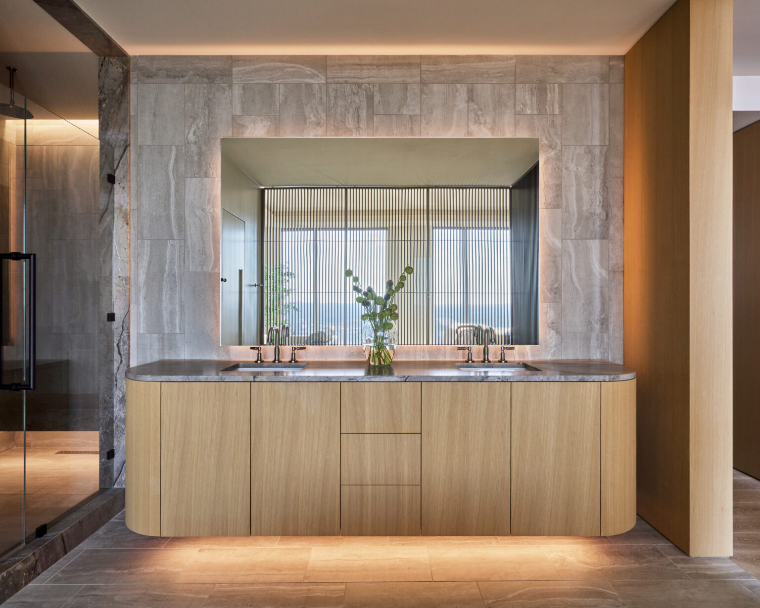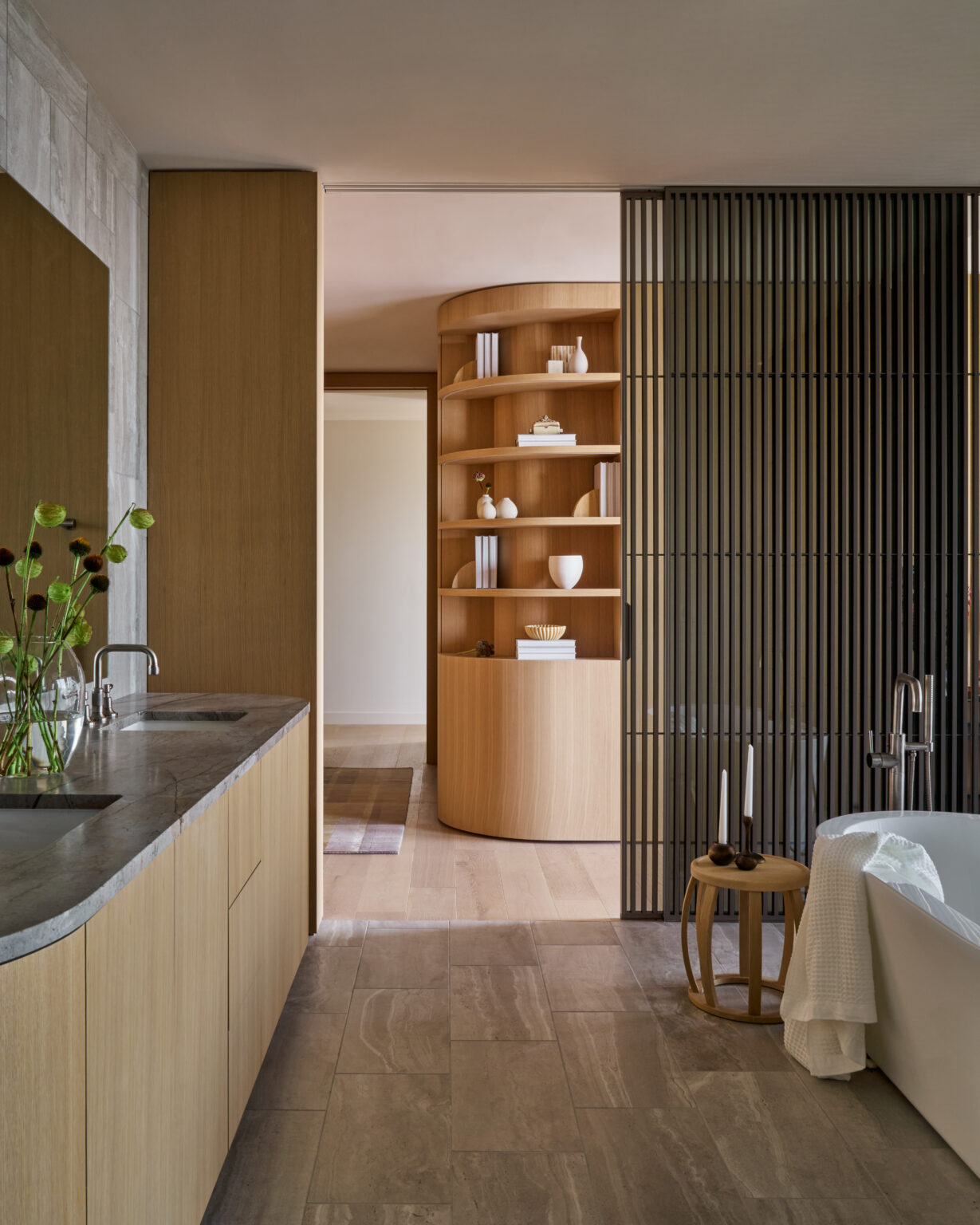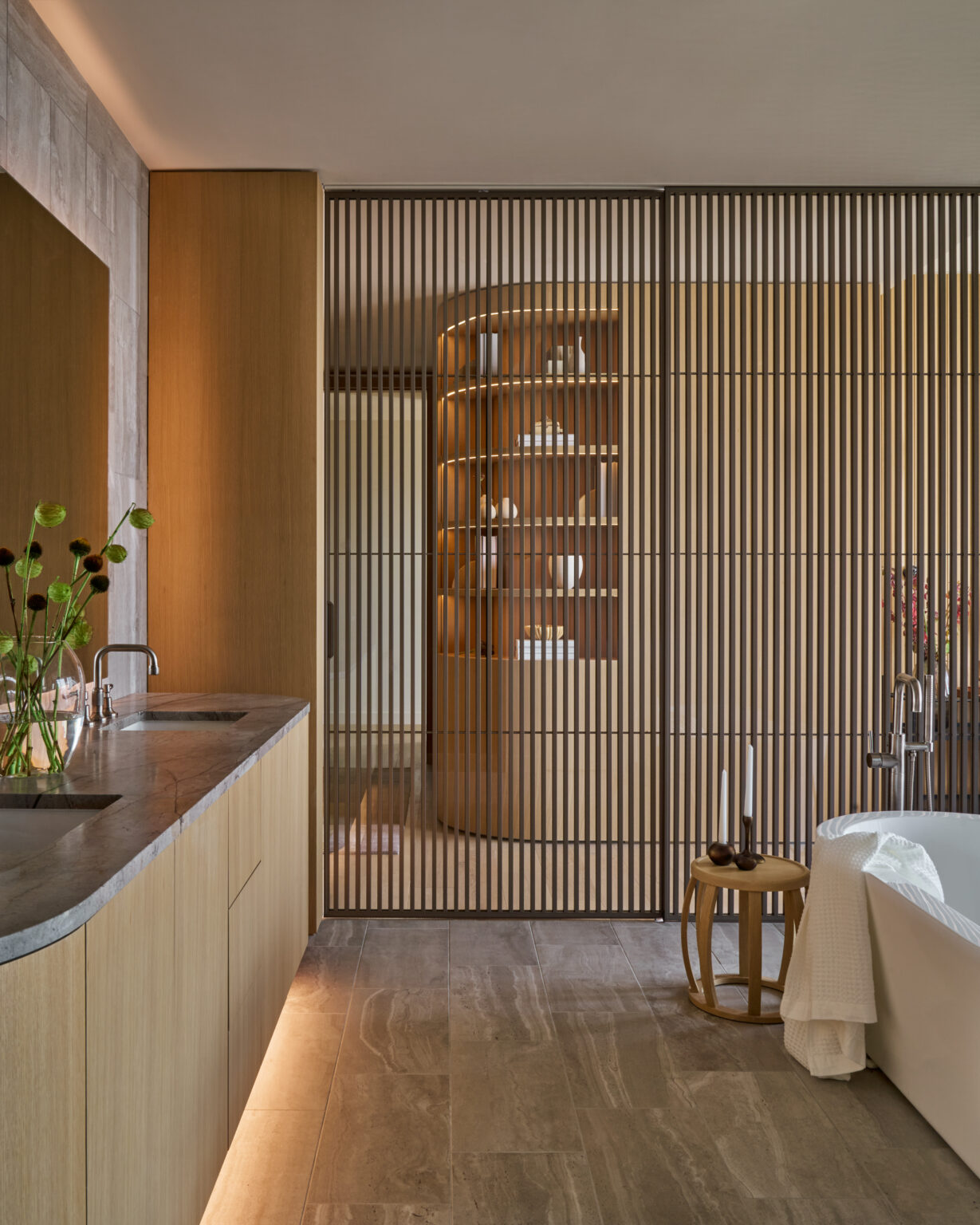 In the primary suite, several custom features blended every inch of the space to feel seamless; a striking 9-foot wooden door with a custom handmade handle crafted from reclaimed wood, and floor-to-ceiling scalloped wood panels extending through the bedroom and closet. The primary bathroom is enclosed by a Rimadesio sliding glass door system, offering a sophisticated balance of privacy and openness —allowing views outward while maintaining discretion from the outside.