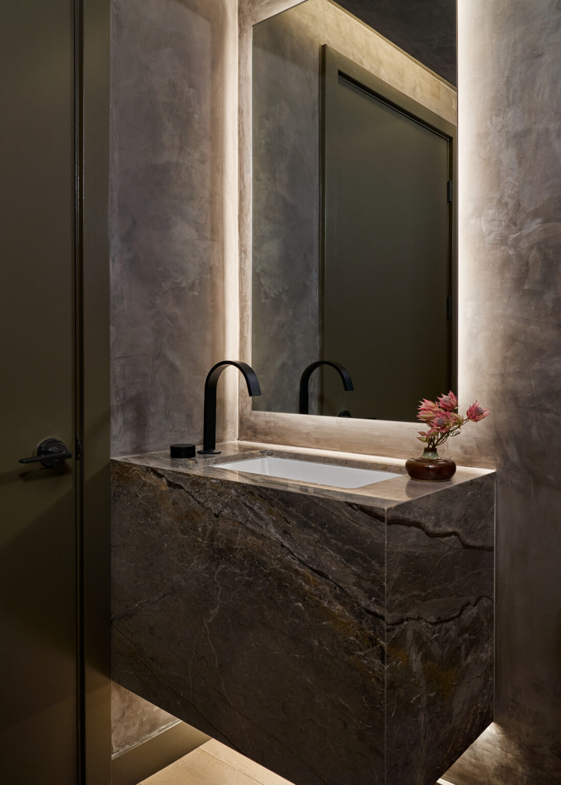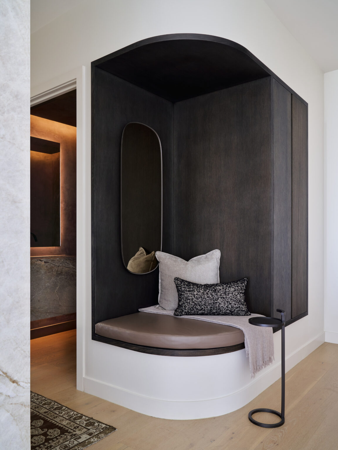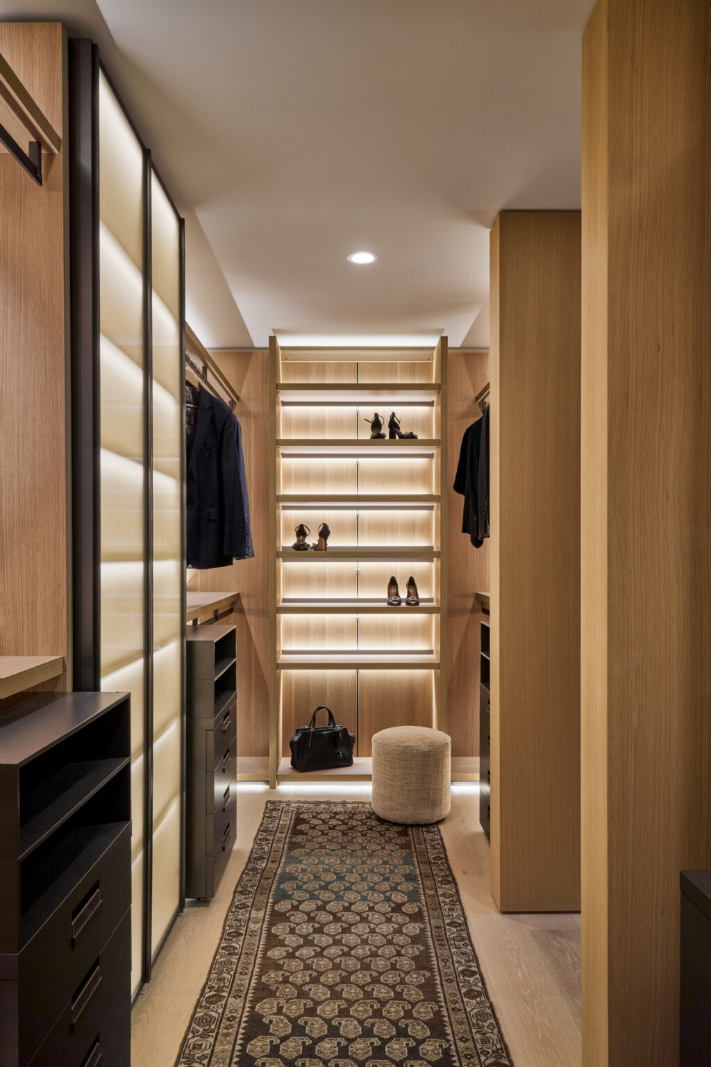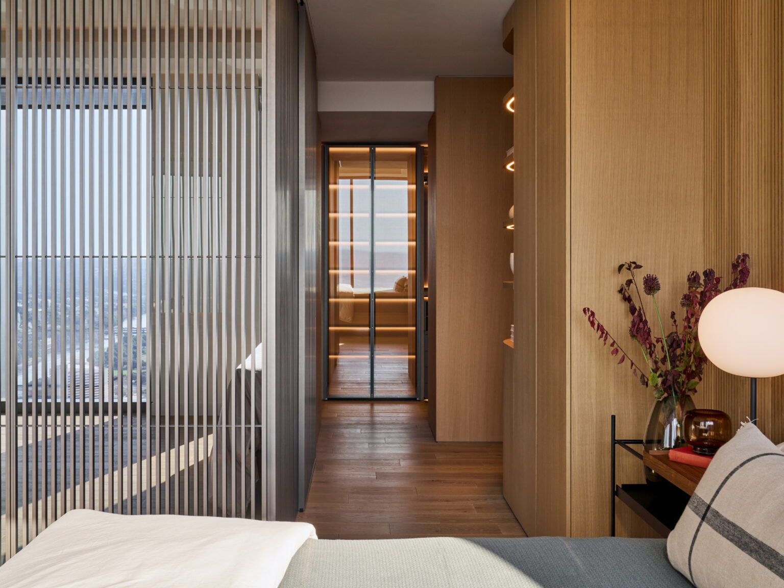 In the primary suite, several custom features blended every inch of the space to feel seamless; a striking 9-foot wooden door with a custom handmade handle crafted from reclaimed wood, and floor-to-ceiling scalloped wood panels extending through the bedroom and closet. The primary bathroom is enclosed by a Rimadesio sliding glass door system, offering a sophisticated balance of privacy and openness —allowing views outward while maintaining discretion from the outside.