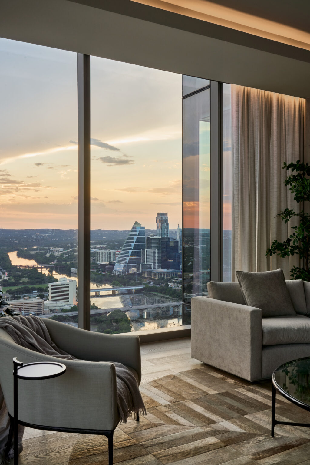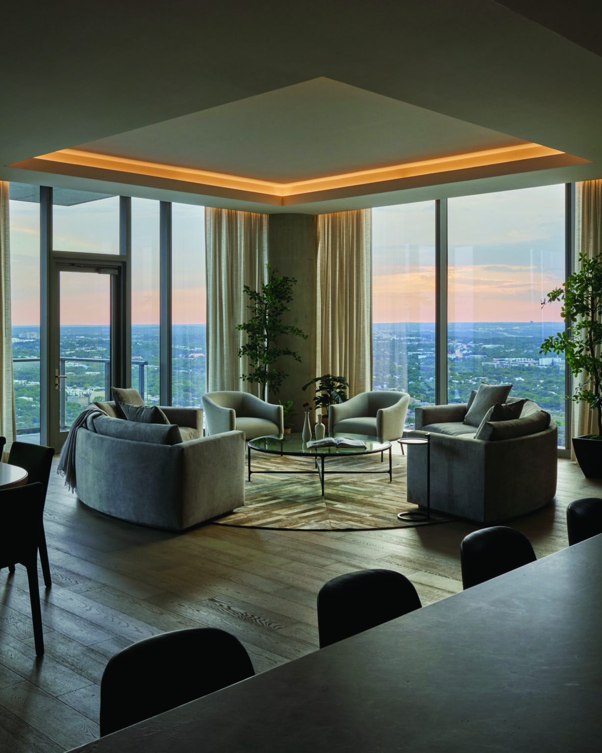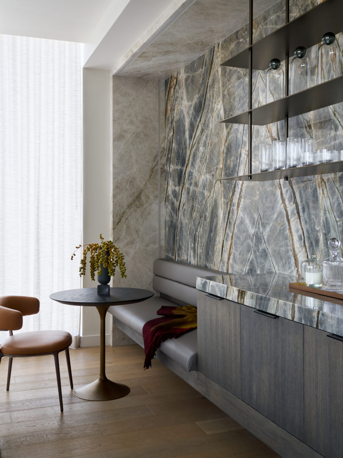 In the kitchen, new panels were matched to the existing panels, blending seamlessly with the custom pantry and wine fridge; framed by a Taj Mahal stone that unified the space. The adjacent cocktail bar featured stone extending across the ceiling and floating shelves, illuminated by integrated lighting. The built-in booth highlights a picturesque view of Lady Bird Lake, supporting the ritual of a morning cup of coffee and evening cocktail at sunset.