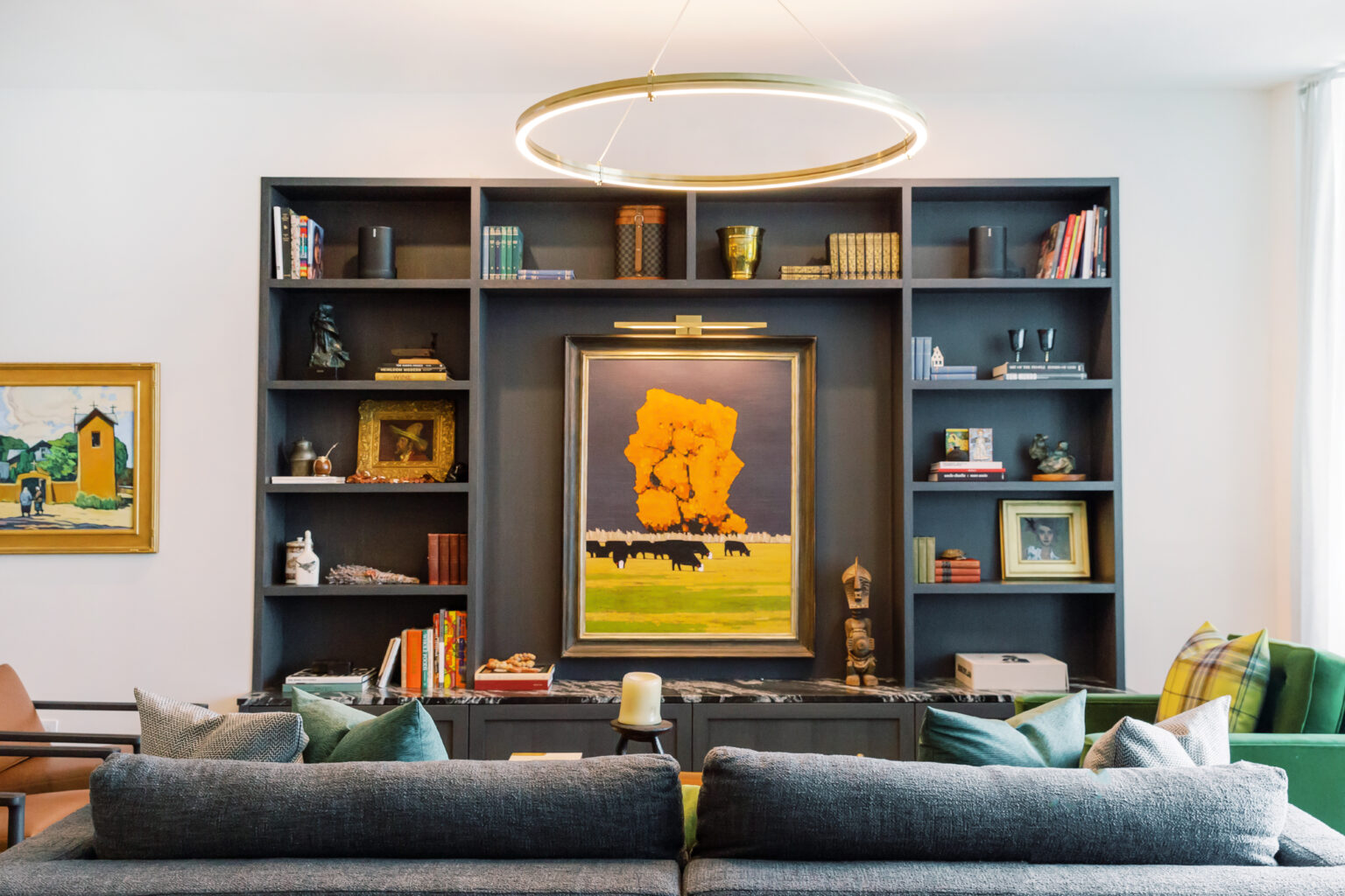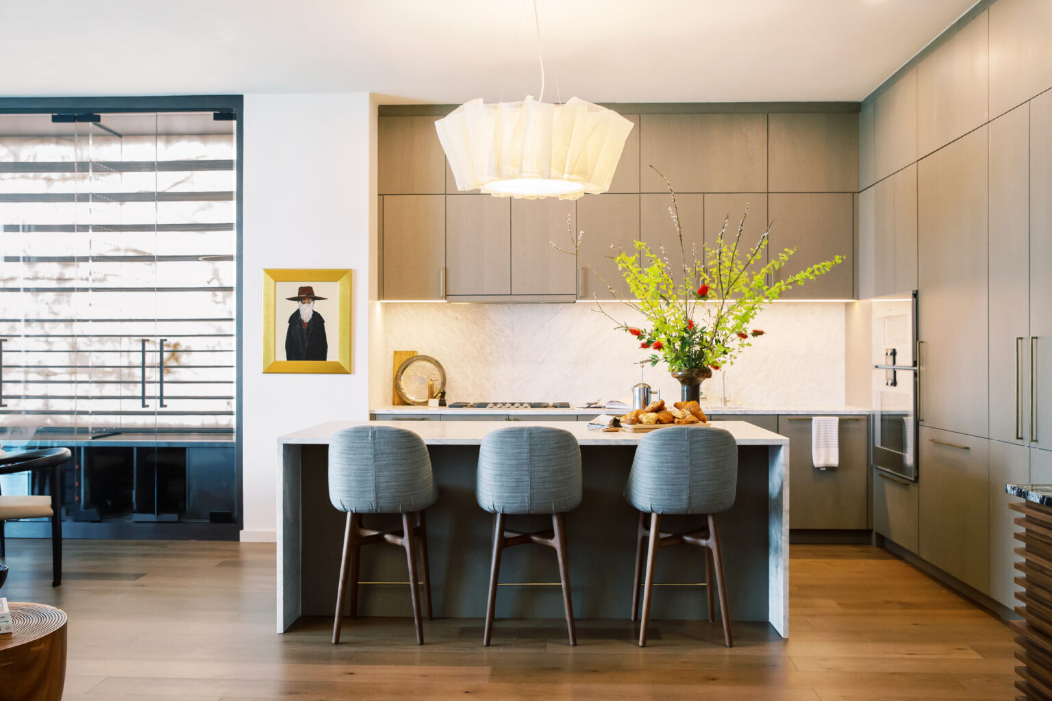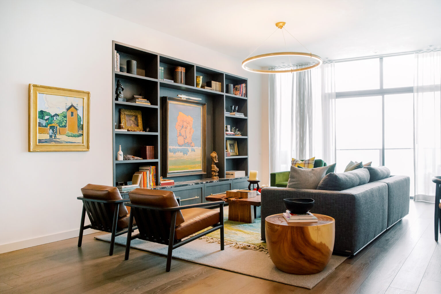 Our clients for this project were a family including two children, moving from their single family home to a new condo downtown. Our intent was to make our clients unit feel more like a home and less like a condo, by creating a warm and curated space. We had a beautiful palette to start with and by adding layers of drapery, wallpaper, and indirect light we were able to add a lot of softness. Utilizing our clients eclectic art collection we were able to mix old world charm with some new modern pieces in order to create a finished look. Since these clients were wine connoisseurs we wanted to make a wine room the focal point of the project. We created a custom wine fridge with backlit onyx. Since we were working with a smaller footprint the backlit onyx acted as a continuation of the glazing which allowed for high impact without compromising visual space. We created a hide wall in one of the bedrooms in order to bring some detailing that reflected the design of the lobby and amenity space.