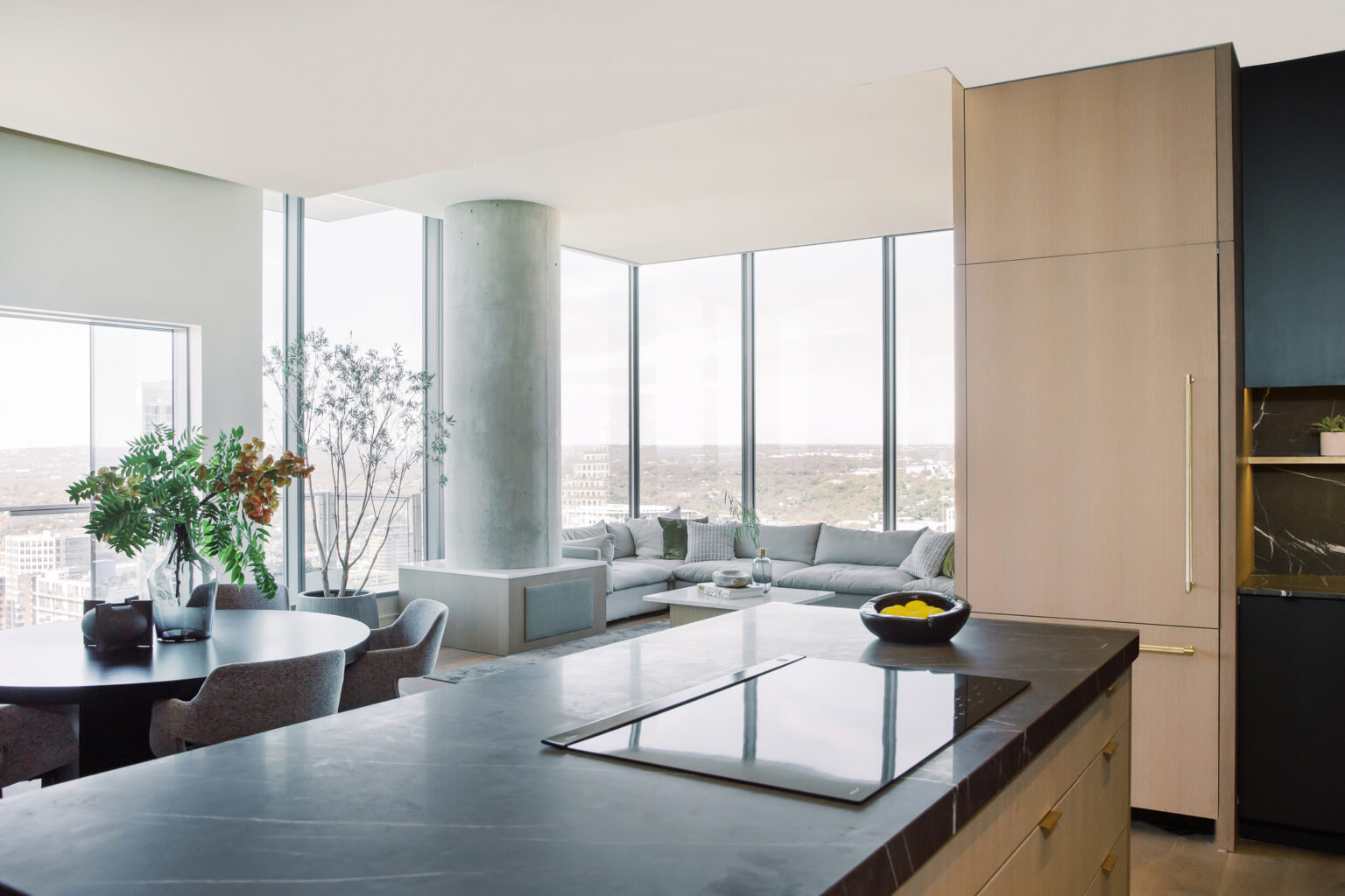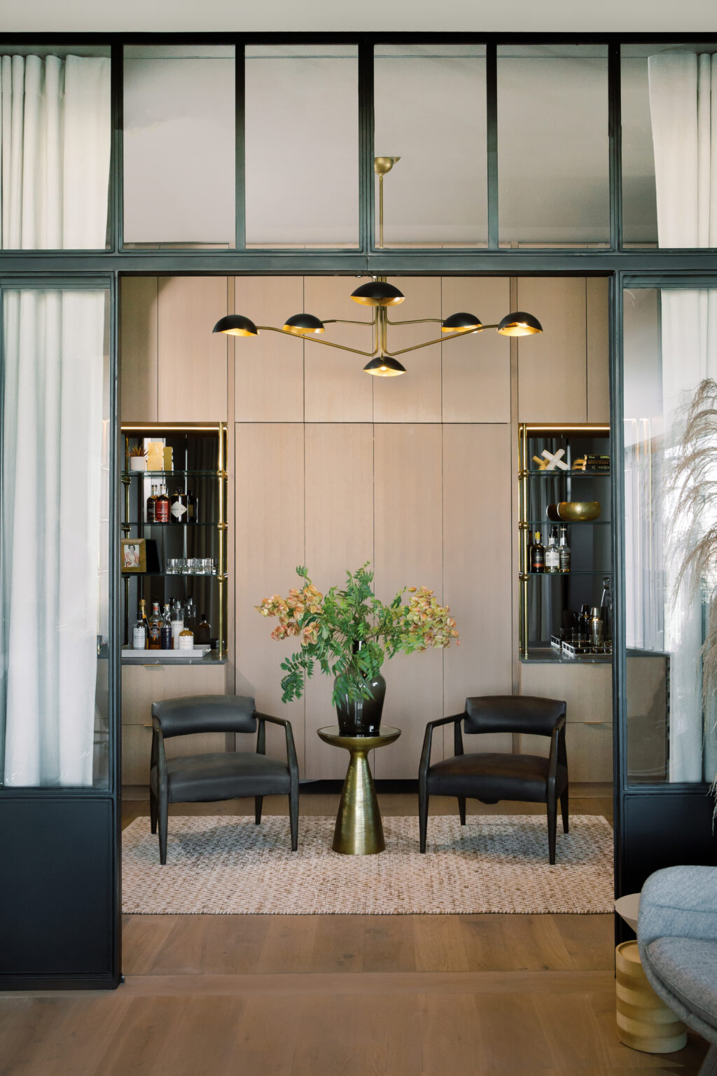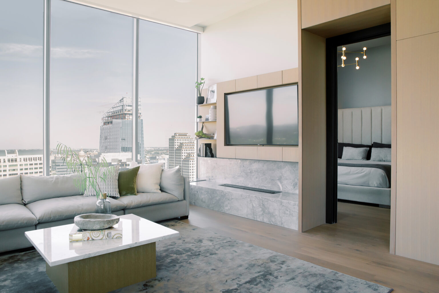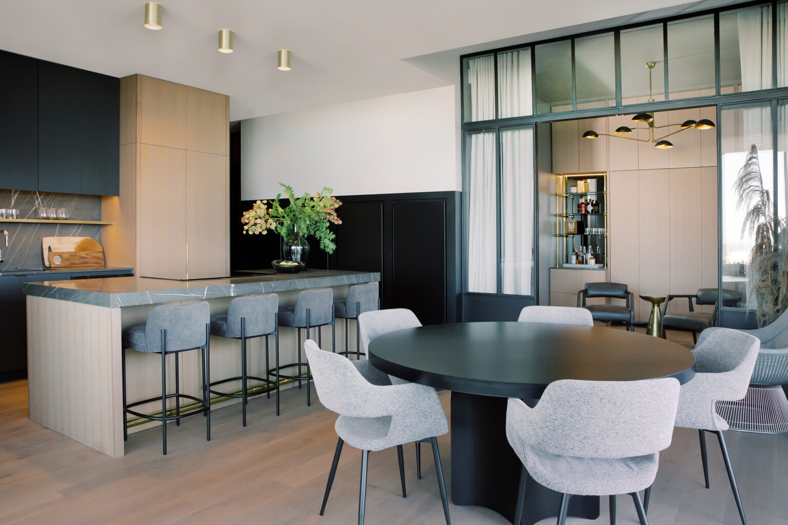 Having had the opportunity to work closely with a long-term client on our third project together, our intent was to create an everlasting home in what once was a standard layout at The W Residence. The juxtaposition of privacy in an open space was intended to create mystery in concealed locations. The concept of blurring the lines of private and public spaces was brought into play by adding fluted glass to multiple doors. The over-scaled steel wainscoting in the entry hallway was created to conceal storage space while also adding more materiality into the unit. Rift Sawn white oak panels wrap from the entry, through the kitchen, and terminate on the opposite side of the unit creating a sense of balance throughout the entire condo. We completely opened the secondary bedroom by adding custom steel and glass doors so that our clients would be able to leave the doors open and allow that room to be able to function as an extension to their dining room. When hosting a weekend guest they are able to use the space as a bedroom by utilizing the murphy bed.