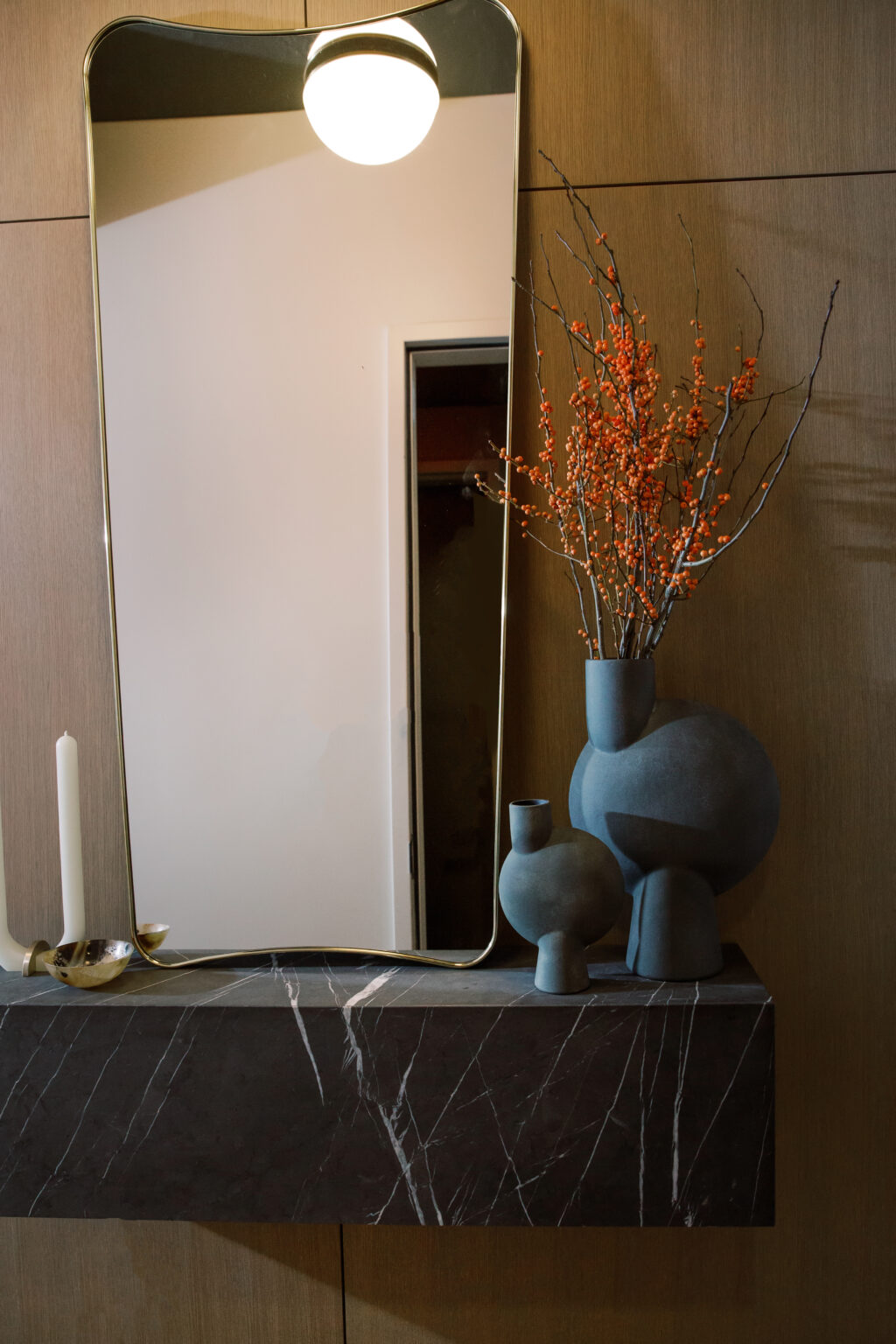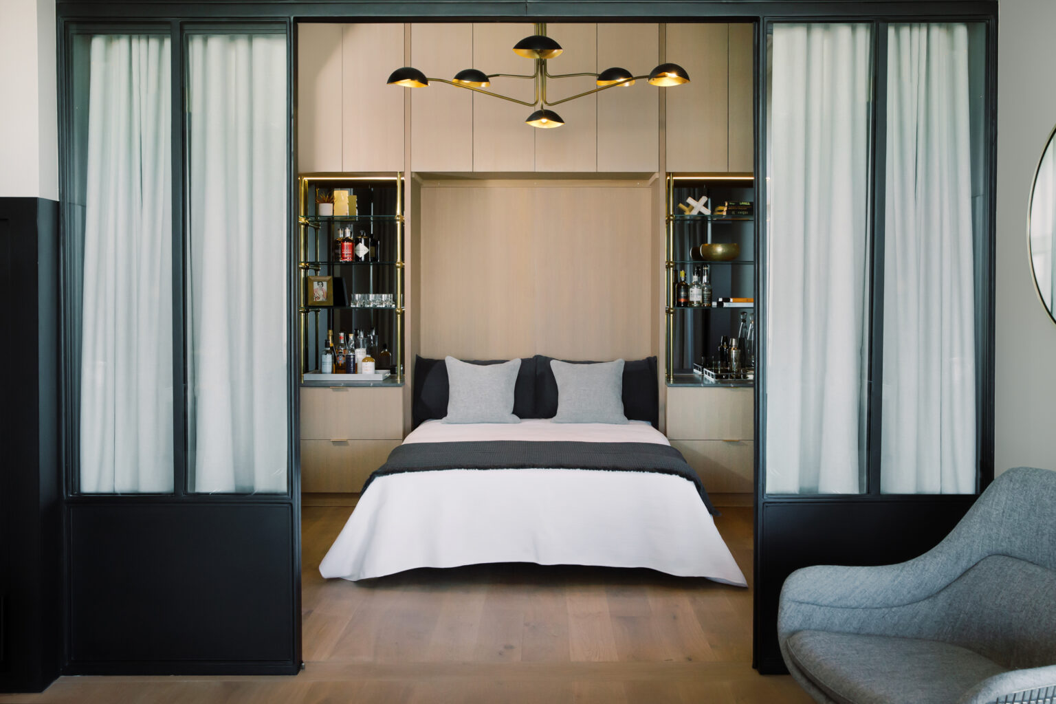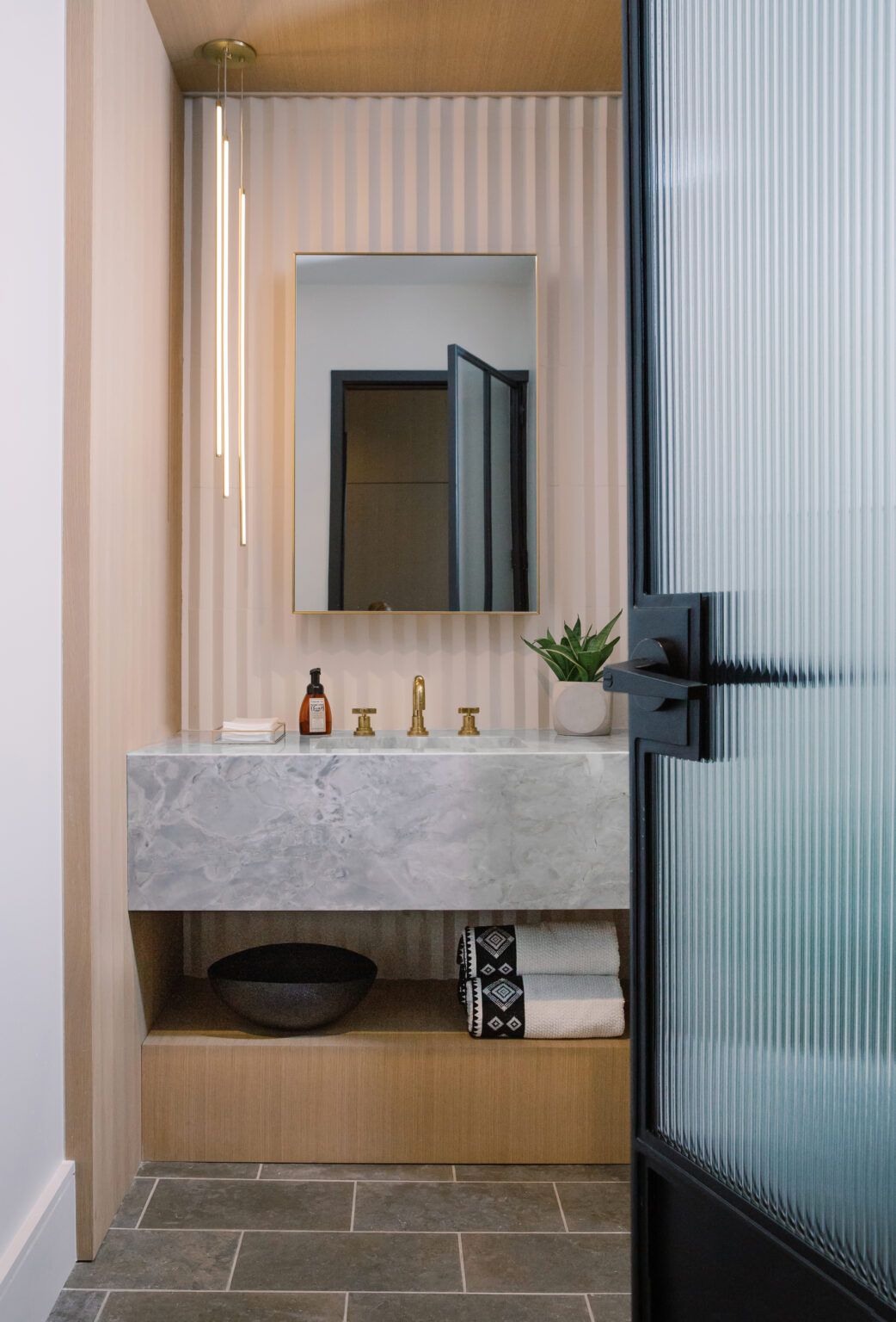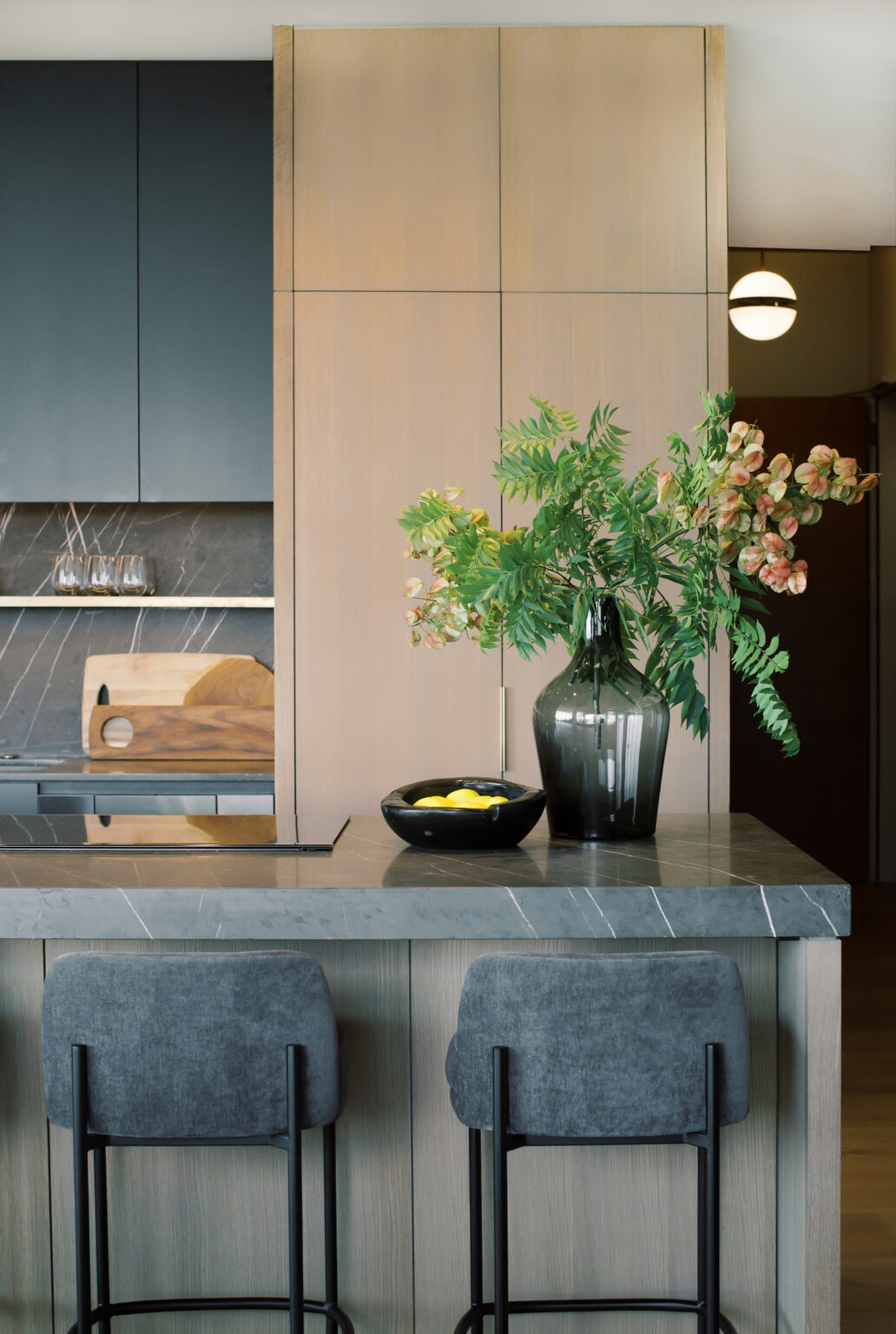 Having had the opportunity to work closely with a long-term client on our third project together, our intent was to create an everlasting home in what once was a standard layout at The W Residence. The juxtaposition of privacy in an open space was intended to create mystery in concealed locations. The concept of blurring the lines of private and public spaces was brought into play by adding fluted glass to multiple doors. The over-scaled steel wainscoting in the entry hallway was created to conceal storage space while also adding more materiality into the unit. Rift Sawn white oak panels wrap from the entry, through the kitchen, and terminate on the opposite side of the unit creating a sense of balance throughout the entire condo. We completely opened the secondary bedroom by adding custom steel and glass doors so that our clients would be able to leave the doors open and allow that room to be able to function as an extension to their dining room. When hosting a weekend guest they are able to use the space as a bedroom by utilizing the murphy bed.